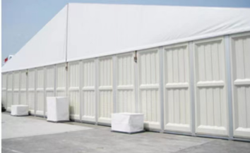 الجدران: قماش PVC أبيض عالي التحمل بوزن 650 جم/متر مربع، شبه حاجز، مقاوم للماء بنسبة 100%، ومقاوم للحريق (DIN4012 B1، M2)، ومقاوم للأشعة فوق البنفسجية.